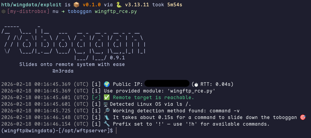I wrote a custom RCE module to use with toboggan, giving me a more convenient to use shell. One small issue I ran into was that my script didn’t log out after, which eventually lead to me hitting the log on limit for the user anonymous. After adding a request to the logout endpoint to my module and restarting the server, I had a nice simple shell.
