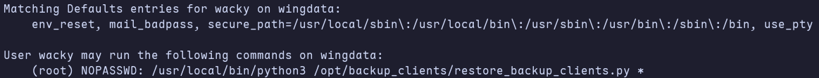The first thing I checked for was wacky’s sudo priviledges with sudo -l, where I found that wacky is allowed to run a python backup script with any input.